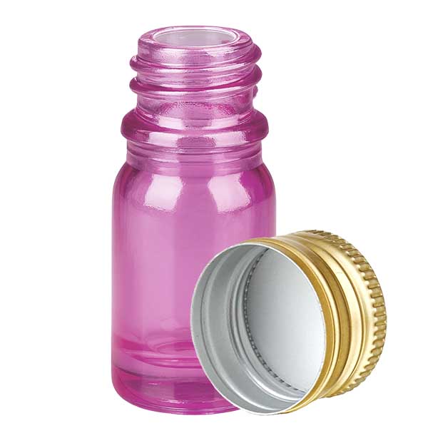 Hoogwaardige 5 ml fles PurpleLine van glas met UT18/5 schroefdraad en elegante 11 mm schroefdop in aluminium-goud standaard. Ideaal voor hoogwaardige monsters, essences of cosmetische producten die niet alleen functioneel, maar ook visueel aantrekkelijk moeten worden gepresenteerd.