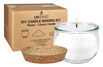 Kit DIY CANDLE « FlameClassic » – Bougie DIY dans un bocal WECK® Contenu du kit « FlameClassic » : 6 bocaux tulipes WECK® originaux de 370 ml 6 couvercles en liège naturel pour WECK RR80 6 mèches Cire en poudre blanche fine et fluide...