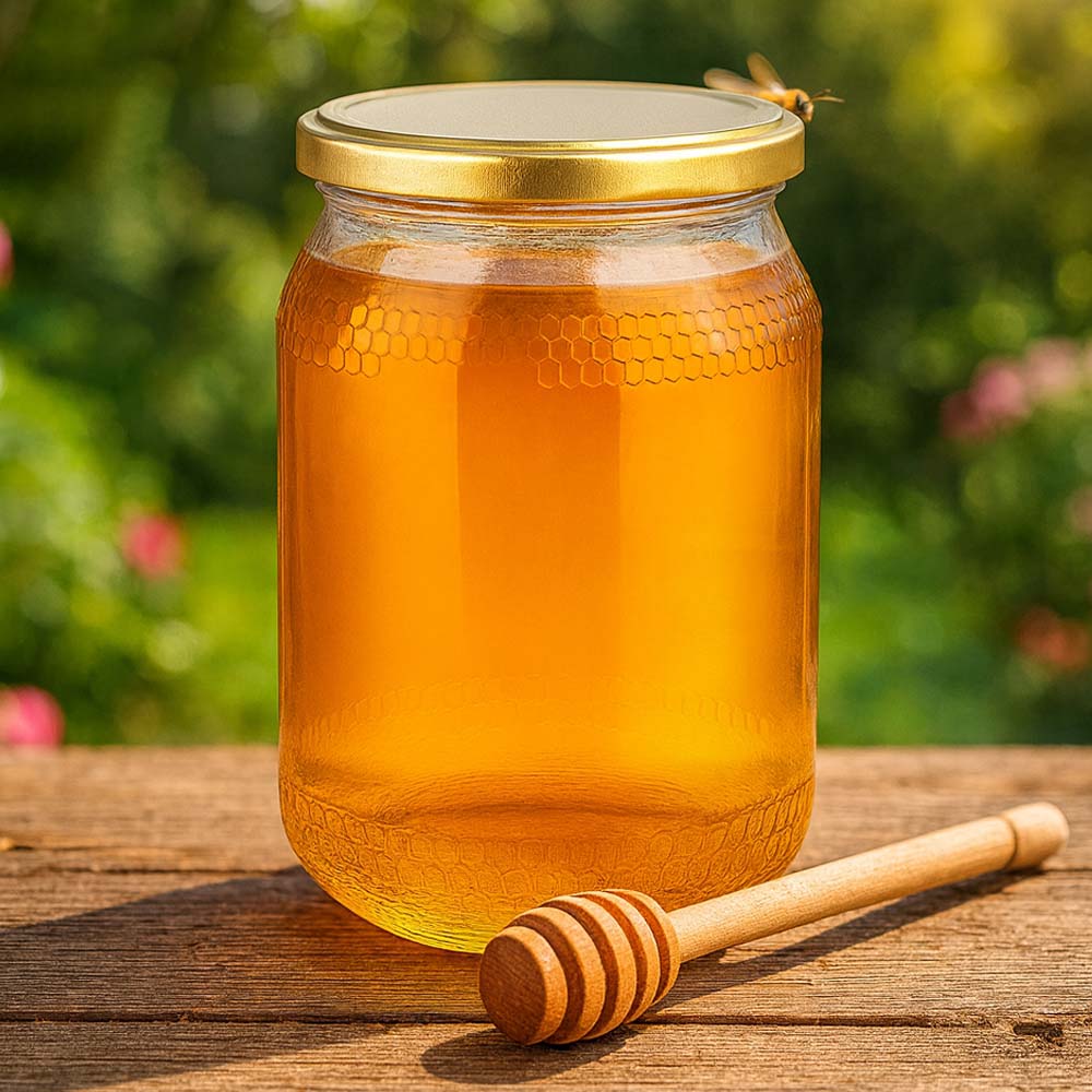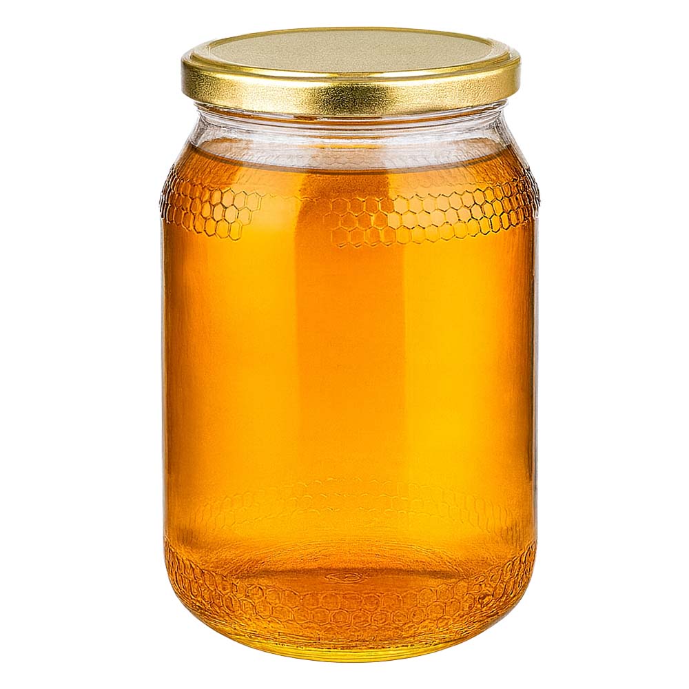 Vasetto in vetro per miele da 1260 g con capsula metallica dorata BasicSeal UNiTWIST. Perfetto per confezioni premium, vendita diretta e presentazioni eleganti.