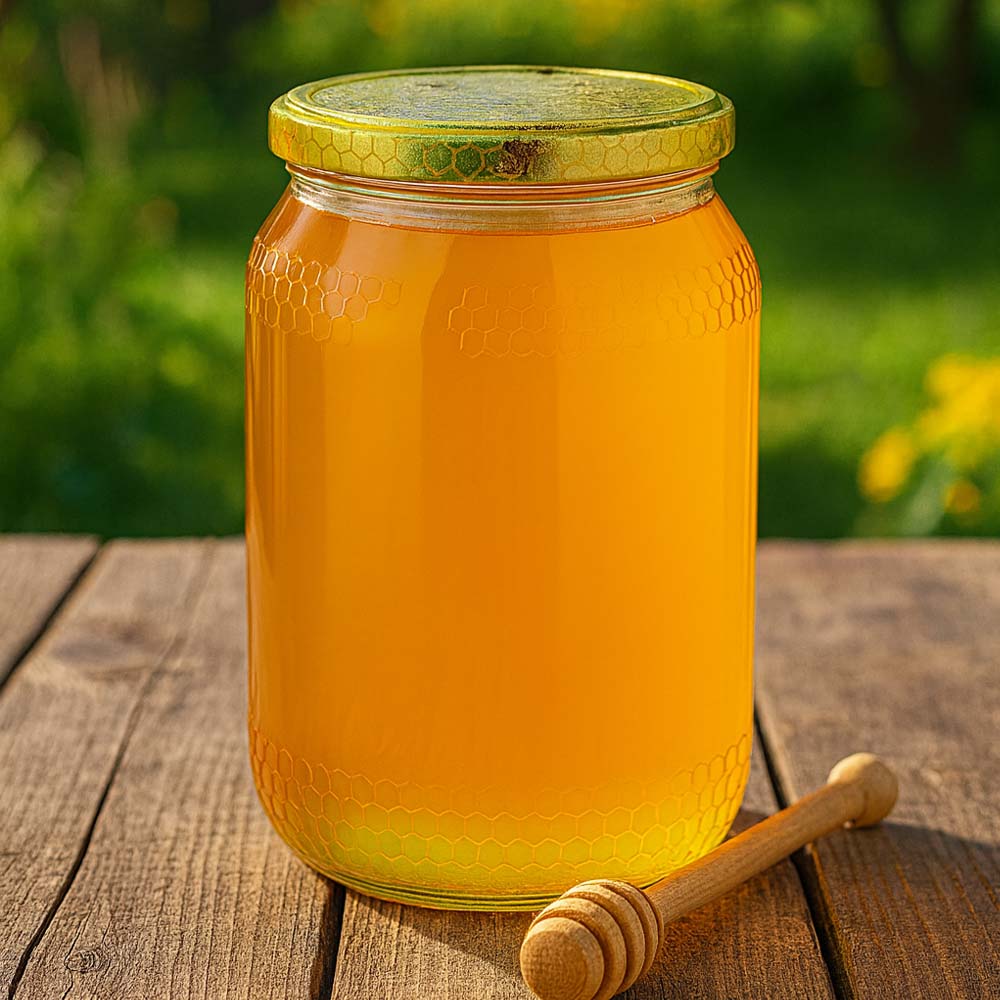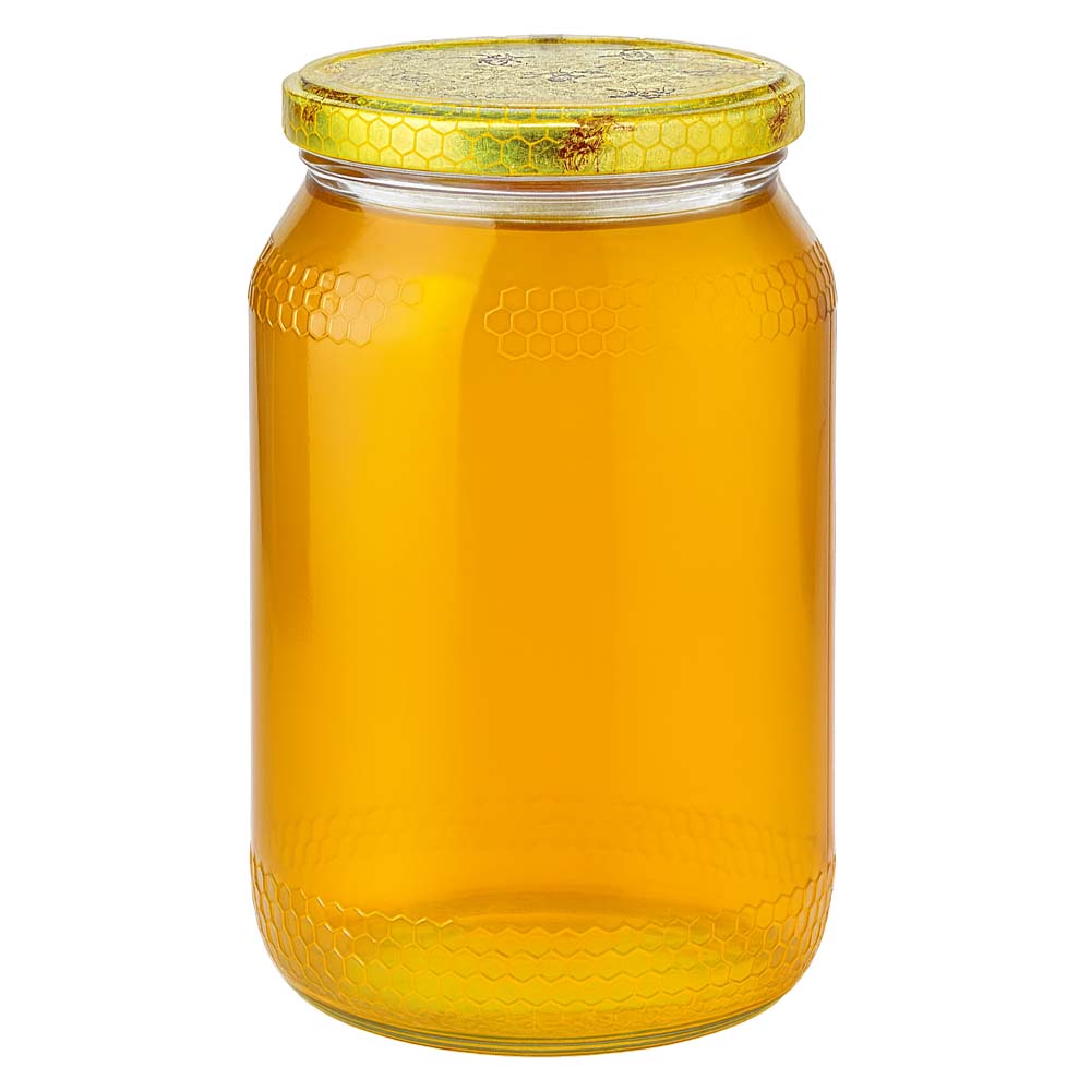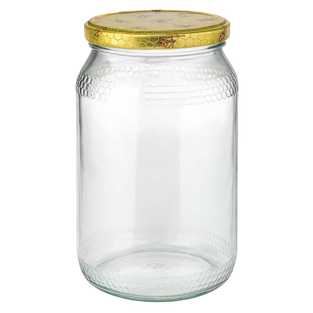 Pot à miel en verre de 1260 g avec couvercle métallique décoré d’un motif rayon de miel...plus