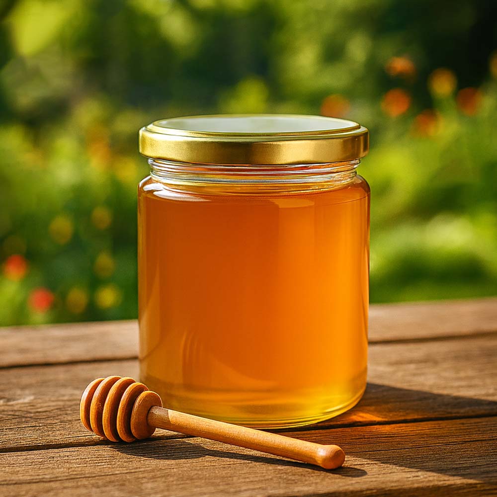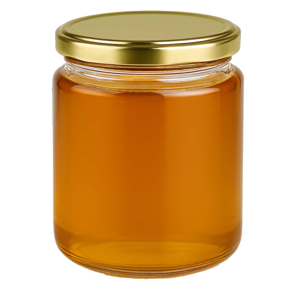 Vasetto in vetro per miele da 350 g con capsula metallica dorata BasicSeal UNiTWIST. Perfetto per confezioni premium, vendita diretta e presentazioni eleganti.