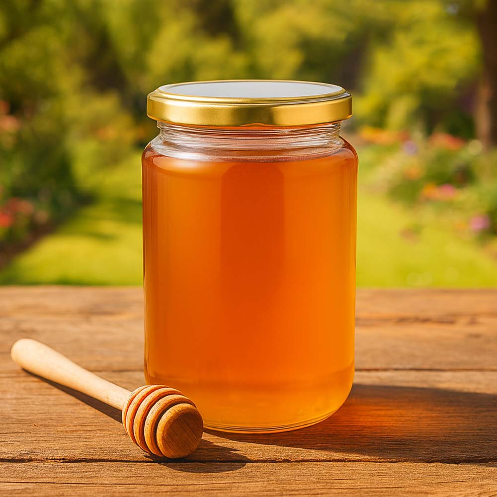 Pot à miel en verre de 450 g avec couvercle doré BasicSeal UNiTWIST. Idéal pour les ventes directes, les coffrets cadeaux et une présentation élégante du miel.