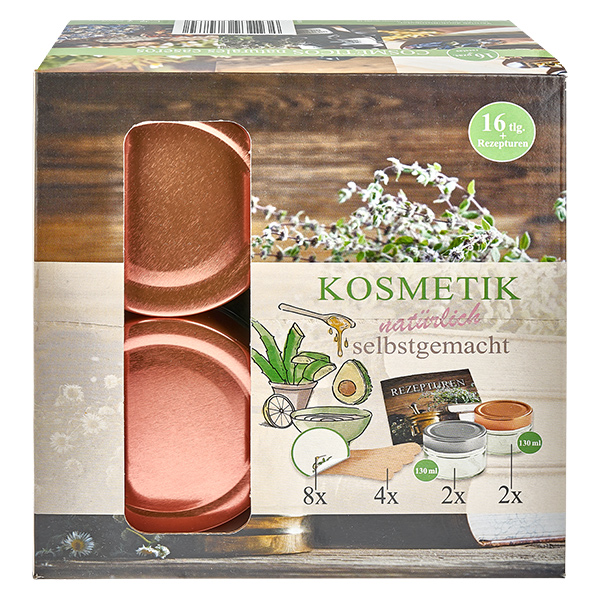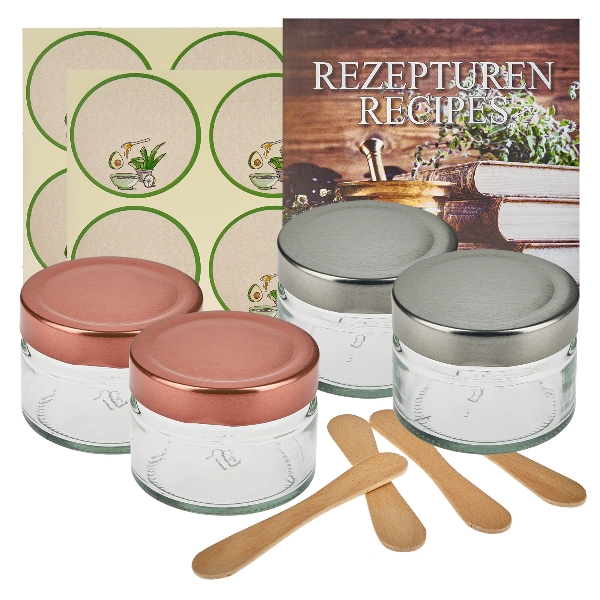 De set bevat vier glazen potjes van 130 ml met een elegante schroefdeksel in zilver- en koperlook, vier houten spatels voor hygiënisch gebruik en acht etiketten om zelf te beschrijven. Het bijgevoegde receptenboekje biedt creatieve ideeën voor eenvoudige, maar verzorgende cosmetica. Bijvoorbeeld voor een natuurlijke lichaamsscrub met kokosolie en suiker of een rijkelijk haarmasker met cacaoboter en amandelolie.